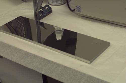 Small amount of liquid epoxy is sprayed onto the conically shaped foils as well as gold-coated replicating glass mandrels. A thin layer of epoxy is desirable in order to reduce mismatch of thermal expansions between the epoxy and the aluminum substrate.