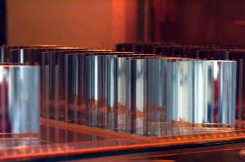 The foil can be removed from the glass mandrels after the epoxy is cured. The removal is possible due to the non-sticking nature of gold on glass. The foil, now with the gold layer on it, acquires the smoothness of the glass.