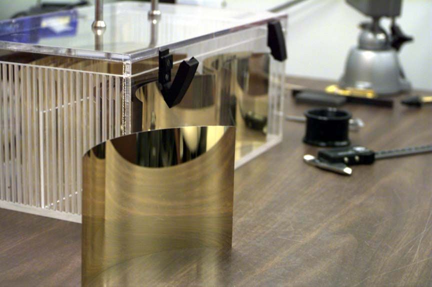 At the X-Ray Astrophysics Laboratory, we pioneered the foil approach in X-ray imaging. For the project Suzaku , 5 telescopes were made at the Mirror Laboratory . Each of these telescopes consists of about 1400 conically shaped mirrors, nested in about 175 layers and each takes the form of a quadrant of a section of a cone. These foils will be positioned in telescope housings, and in a 2-stage configuration which will focus x-ray at a focal length of 4.5 or 4.75 meters. Together with a pre-collimator stage, each telescope has a diameter of about 40 cm, and weighs approximately 20 kg.