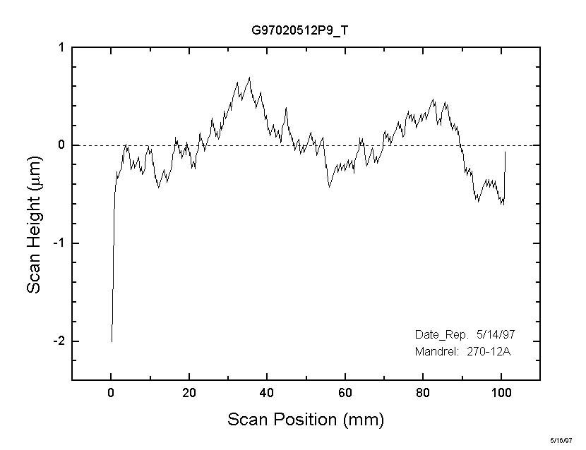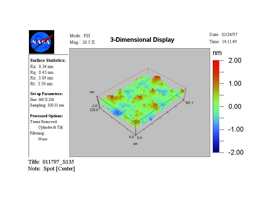 Finer details of surface characteristics can be more efficiently resolved with an optical interferometric profiler. Such profiler provides 2D and 3D display and analysis. The lateral resolution is better than a micron at high magnification, with a depth resolution of about 0.5 Angstrom. Roughness at the sub-nanometer range is important for x-ray reflectivity. A Typical scan of a gold-coated foil is shown.