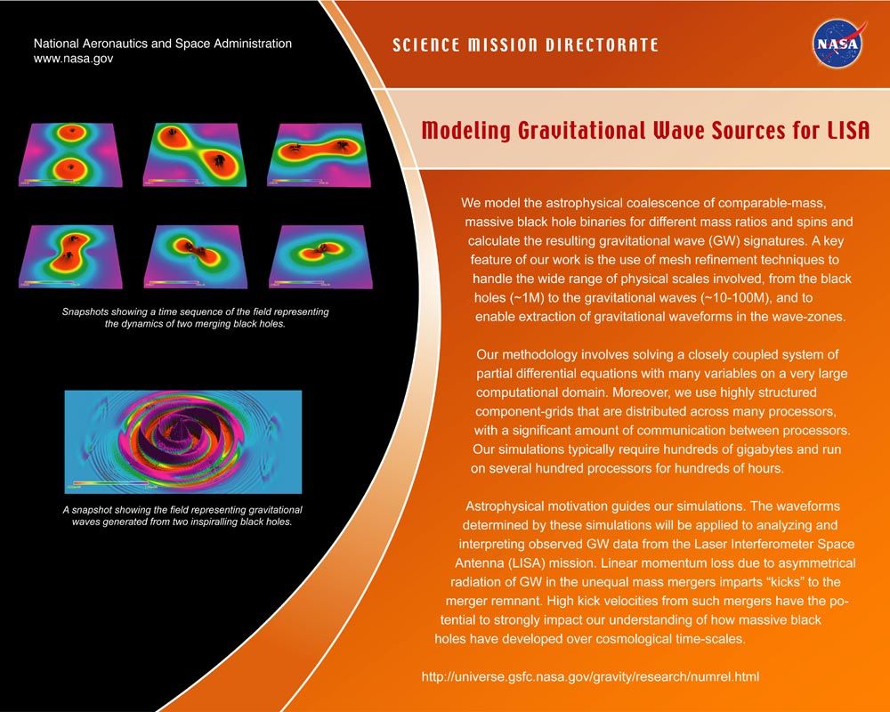 OverviewNumerical relativity is the study of Einstein's equations of general relativity using computer simulations. Groups of scientists around the world, like the group at the Goddard Space Flight Center, are using supercomputer simulations based on Einstein's equations to study how space and time change when very massive objects (like black holes and neutron stars) collide in the universe. The focus of the Goddard group is on applying numerical relativity simulations to model such mergers for gravitational wave and astrophysical applications.Numerical Simulation Techniques![]() | |||||||||||||